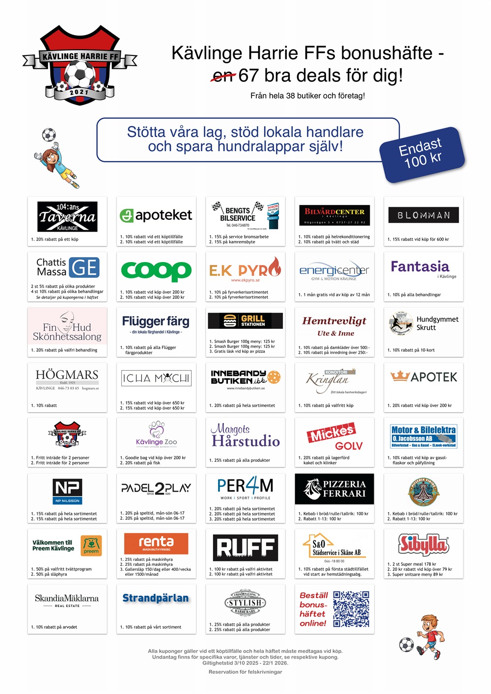 Vi är väldigt glada över att kunna erbjuda ett bonushäfte med hela 67 rabattkuponger med fokus på butiker och företag i Kävlinge!
